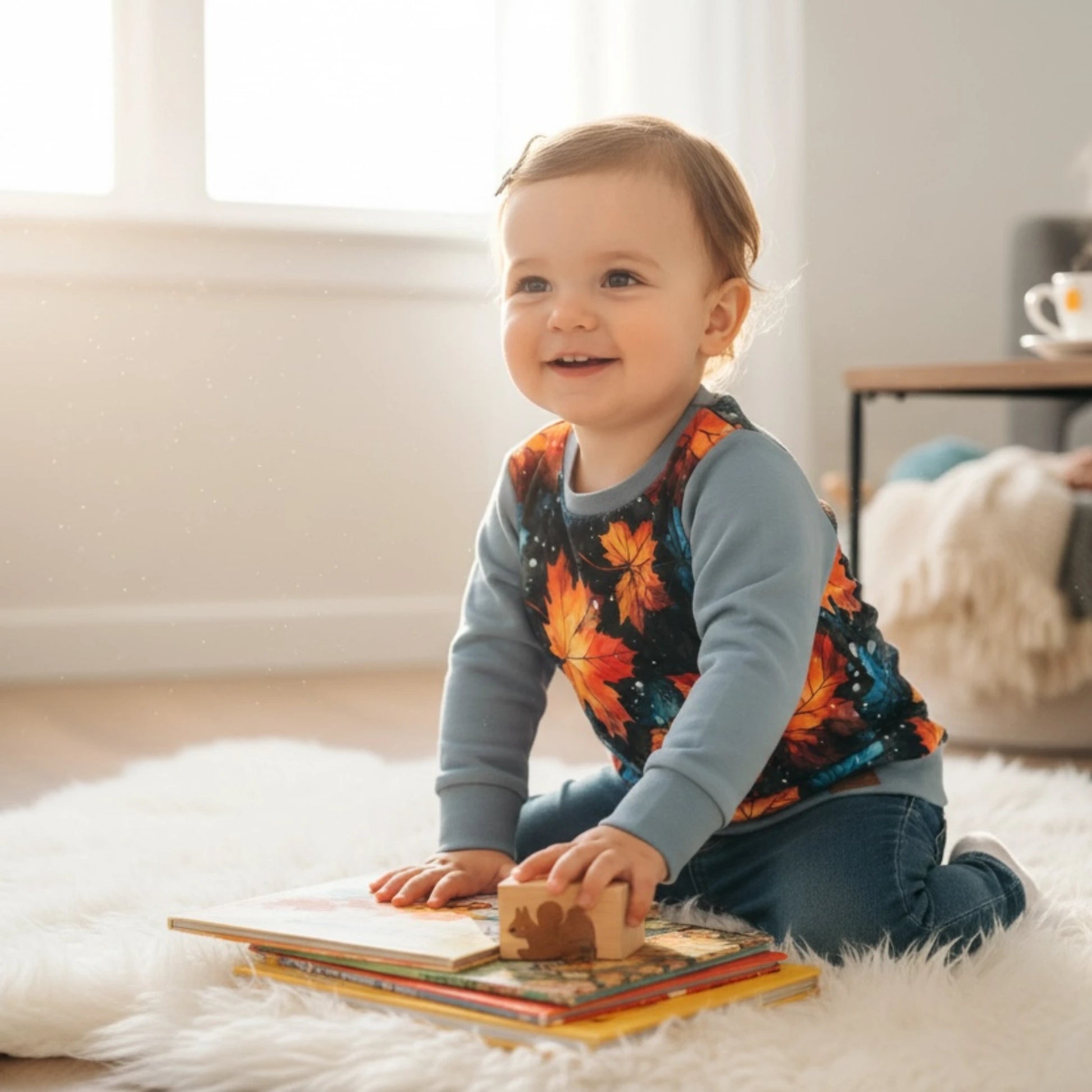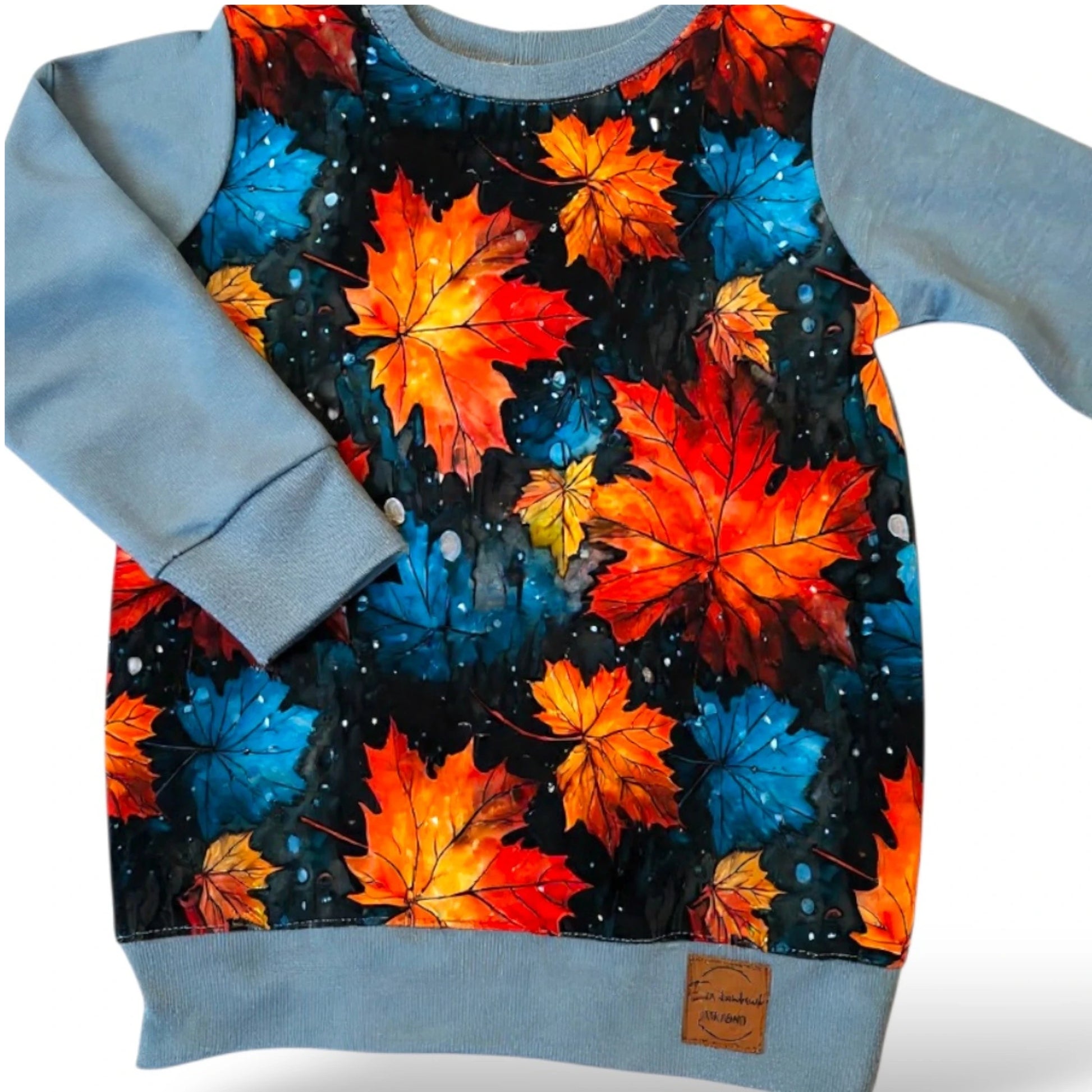 Unod a szürke hétköznapokat? Ez a "Varázslatos Ősz" pulóver garantáltan vidámságot csempész a mindennapokba. A vibráló narancs, vörös és sárga juharlevél minta a hűvös kék alapszínnel kombinálva egyszerre vagány és természetes hatást kelt. A Fiúknak és lányoknak tökéletes választás a felfedezőutakra.