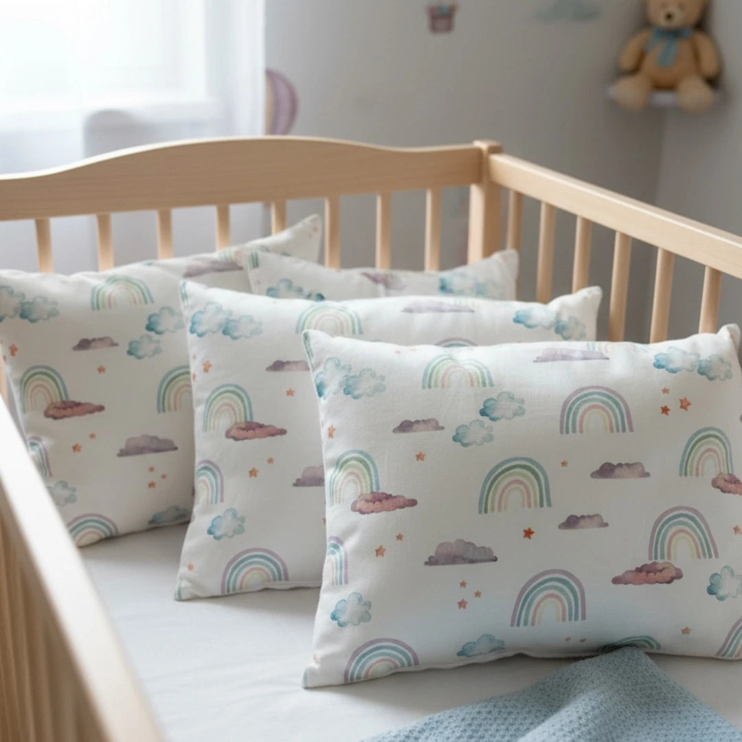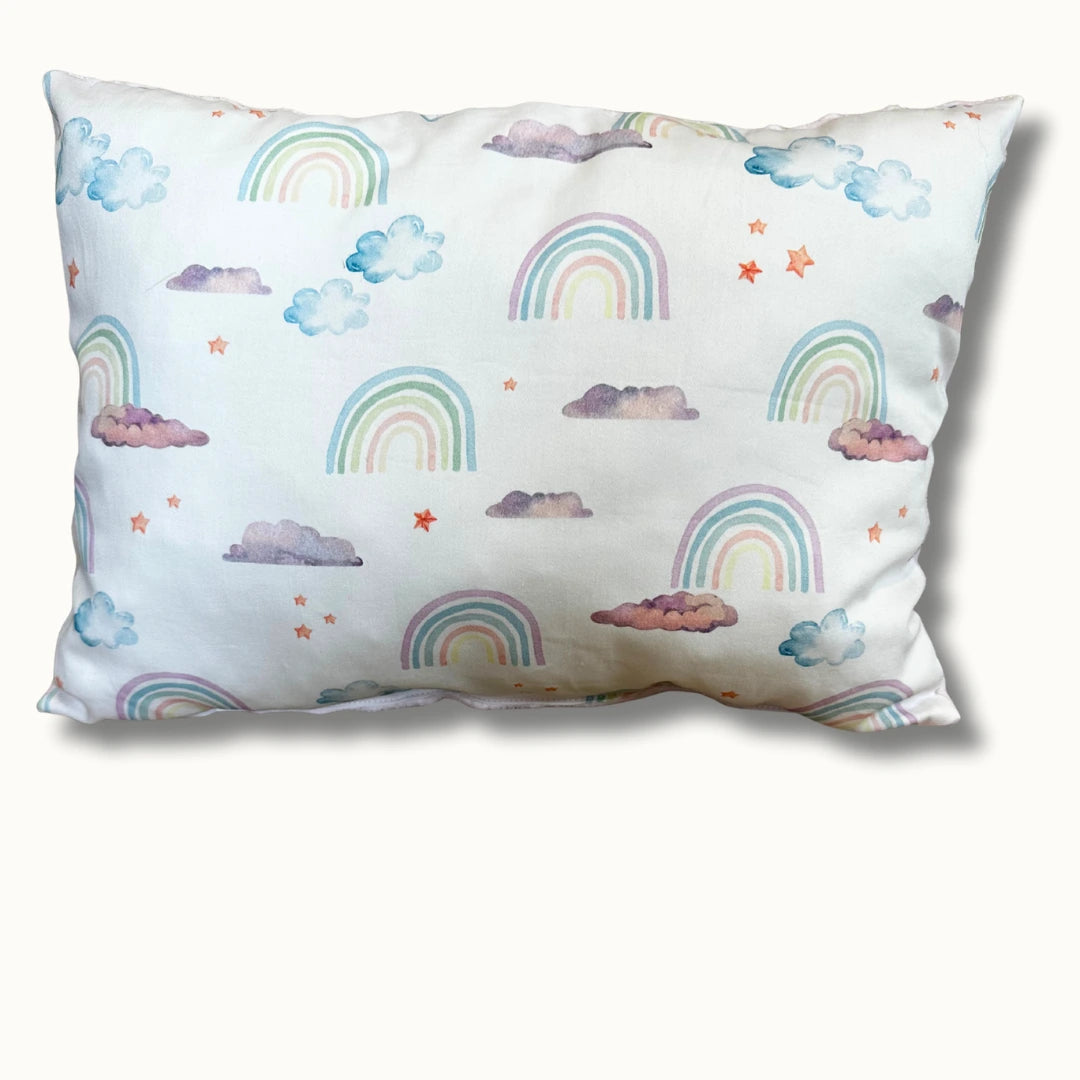 Ez a tündéri, szivárványokkal, felhőkkel és csillagokkal díszített párna nemcsak a szemnek kedves, hanem a legpuhább pihenést is biztosítja kisbabád számára. A gondosan válogatott anyagok és a bájos minta tökéletes harmóniát teremt, legyen szó alvásról vagy a babaszoba dekorálásáról.