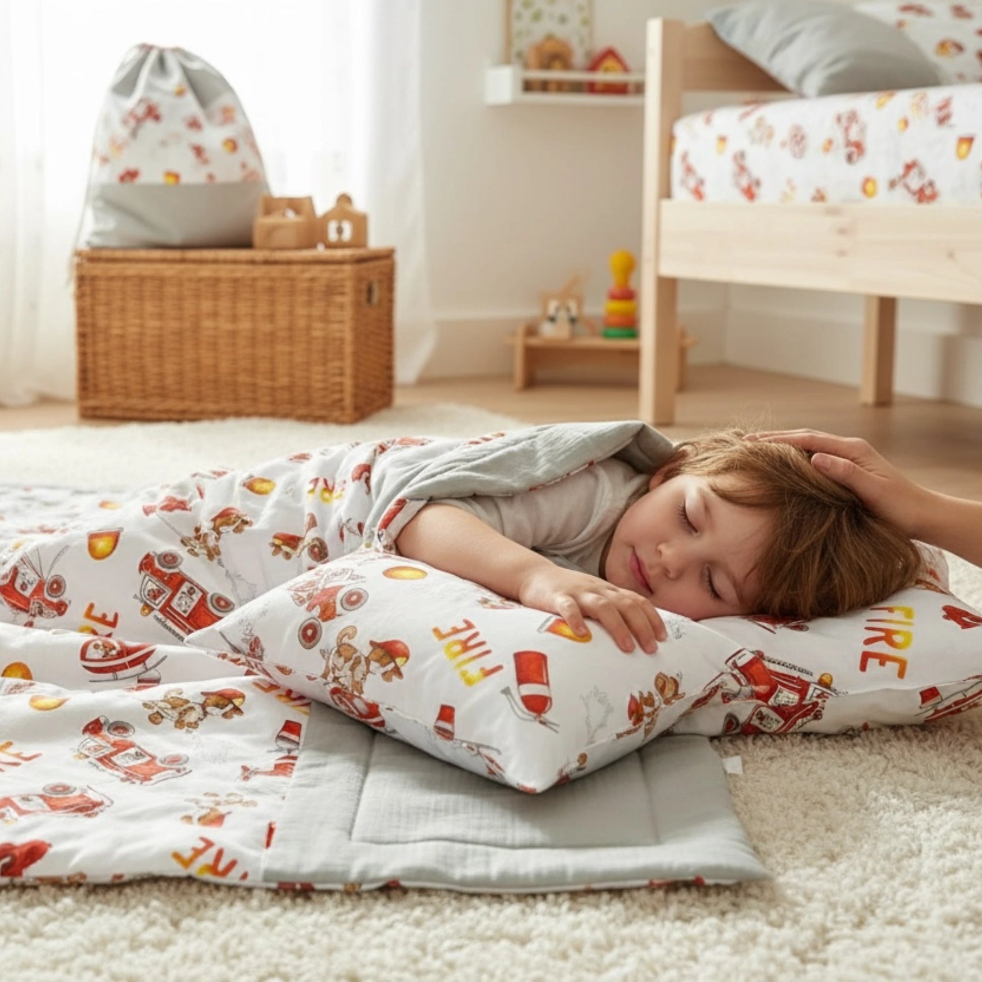 Ezzel a fantasztikus tűzoltós szettel garantáltan kisfiad lesz az óvoda hőse. A piros tűzoltóautókkal, helikopterekkel és lánglovagokkal díszített szett nemcsak vagány, de minden darabja a pihentető alvást és a kényelmes készülődést szolgálja.