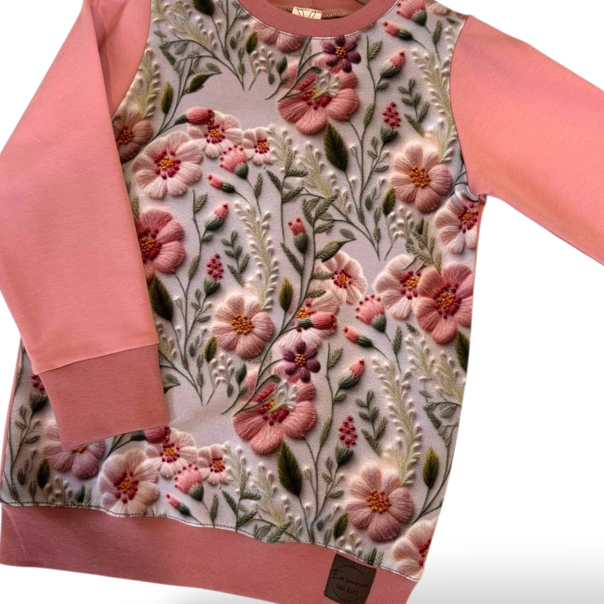 Ez a gyönyörű, mályva színű pulóver nem egy átlagos darab. Az elejét díszítő különleges, részletgazdag virágminta olyan hatást kelt, mintha kézzel lenne hímezve, így igazán ünnepivé varázsolja a hétköznapokat is. Legyen szó egy családi fotózásról, vendégségről vagy csak egy otthoni bekuckós kakaózásról, kislányod imádni fogja.